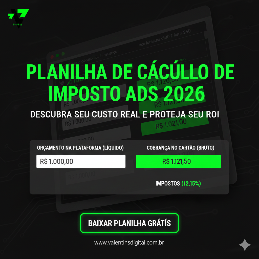 Desde que comecei a lidar profissionalmente com gestão de tráfego pago para clínicas e negócios de beleza, vi muitas mudanças de impostos e regras de plataformas. Mas confesso: 2026 está sendo diferente. O ano começou com uma novidade que pegou muita gente de surpresa: Em 2026, o imposto sobre anúncios (Meta e Google Ads) no Brasil é de 12,15%, composto por PIS/COFINS, ISS e o início da transição para o IVA (IBS/CBS). Esse percentual, além de impactar a precificação e o planejamento, trouxe uma enxurrada de dúvidas sobre a viabilidade das campanhas e a diferença entre os modelos de pagamento. Este artigo é fruto da minha experiência direta com dezenas de clínicas e profissionais do setor, aliado a informações oficiais e uma planilha de cálculo gratuita que desenvolvi após gerenciar mais de R$ 10 milhões em anúncios sob as novas regras de 2026.